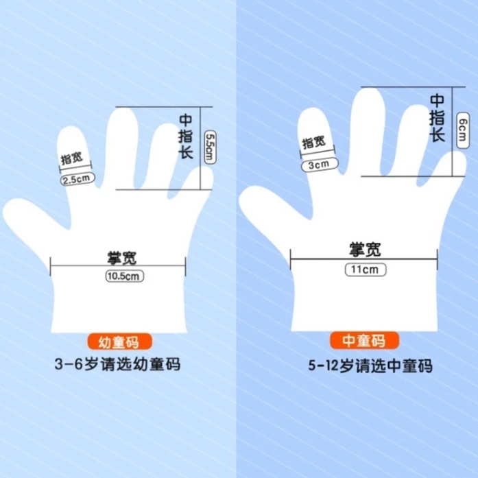 – Made from low-density polyethene plastic, these gloves for kids are lightweight but don’t sacrifice strength. The material won’t tear to ensure little hands stay clean and protected from nasty germs. Our kid’s Disposable gloves are PE, good quality and non-toxic (food grade)