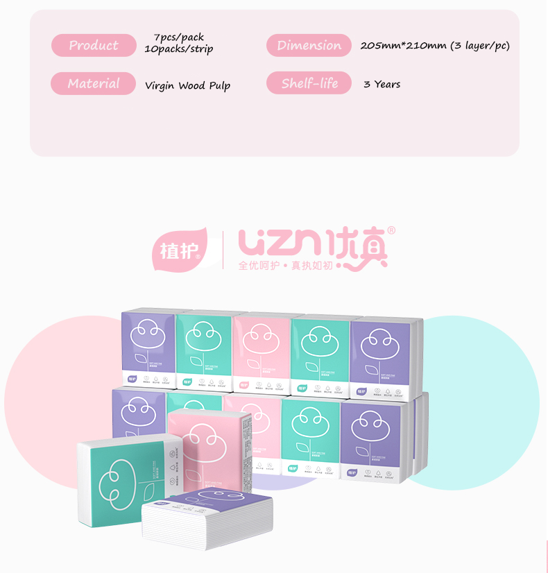 – Each roll contains 10 packs of tissues with 7 sheets each